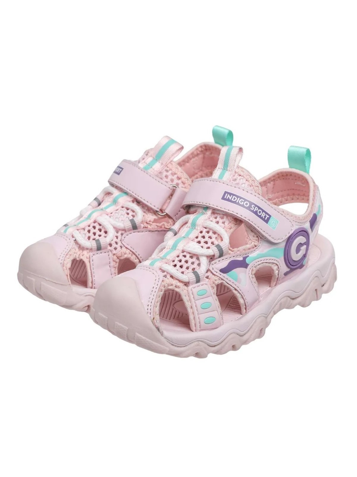 Сандалии Indigo Kids с открытой пяткой — широкий ремешок сзади фиксирует, но не давит и не натирает. Сетчатый текстильный язычок и отверстия по бокам пропускают много воздуха, нога меньше потеет. Закрытая носочная часть защищает пальцы от травмирования во время активных игр. Застегиваются на липучку — обувь плотно прилегает к стопе. Петельки спереди и сзади — удобно надевать и снимать. Декорированы шнуровкой. Рифленая подошва из ТЭП — хорошо гнется, прочная и не скользит. Подходят для долгих летних прогулок, можно взять с собой на пляж.