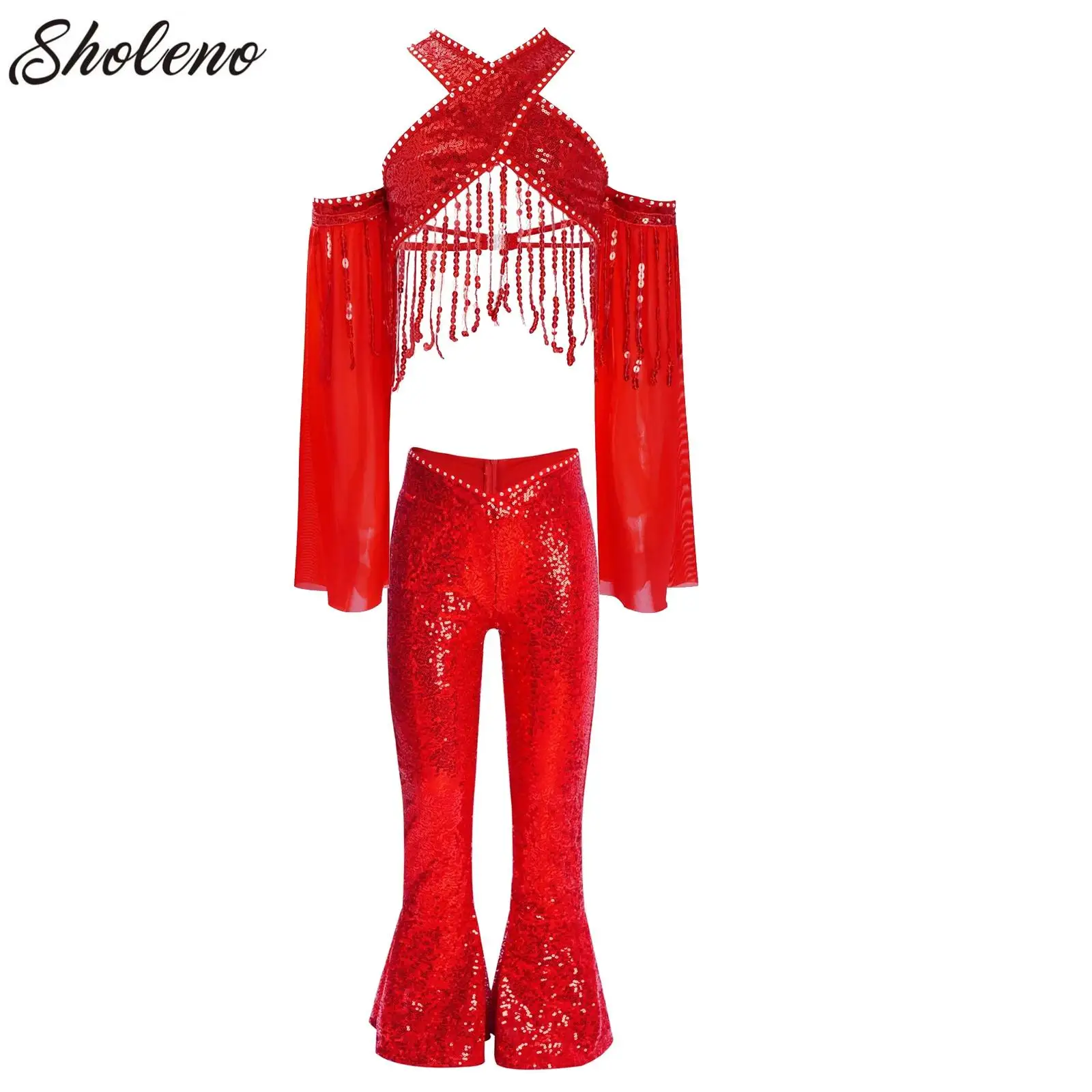 Kids Girls Jazz Dance Costume Sequin Outfits Flared Sleeves Crop Top with Flared Hem Pants for Belly Performance Competition