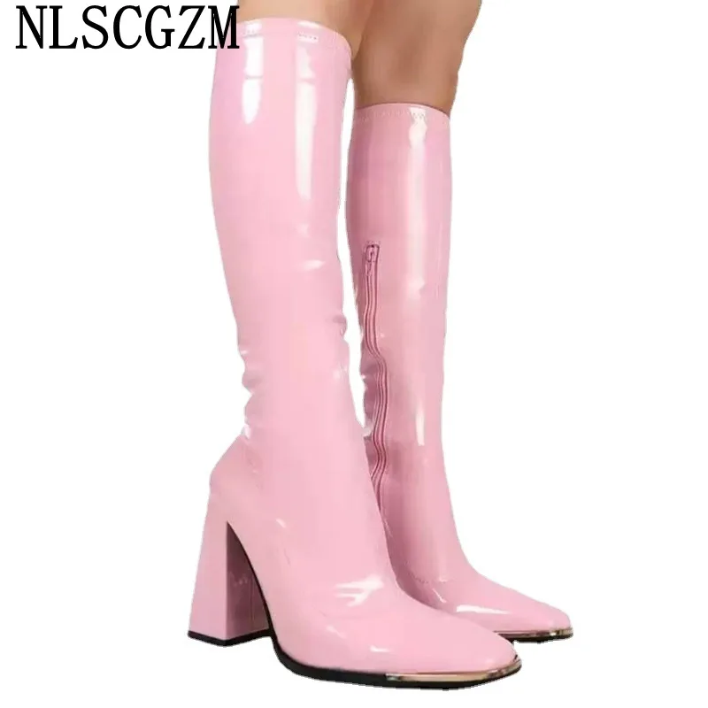 Сапоги женские высокие до колена, высокие Сапоги из лакированной кожи на высоком каблуке