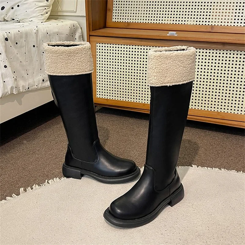 Сапоги рыцарские на толстой подошве, женская обувь, новинка 2023, зимние плюшевые сапоги из хлопка, зимние сапоги, простые сапоги с круглым носком