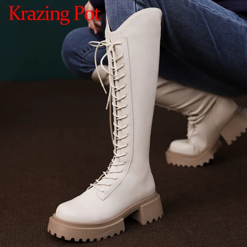 Сапоги Krazing Pot из натуральной кожи с круглым носком на среднем каблуке, водонепроницаемые сапоги для верховой езды, Прошитые нитки, простые Стильные сапоги до бедра с перекрестной шнуровкой