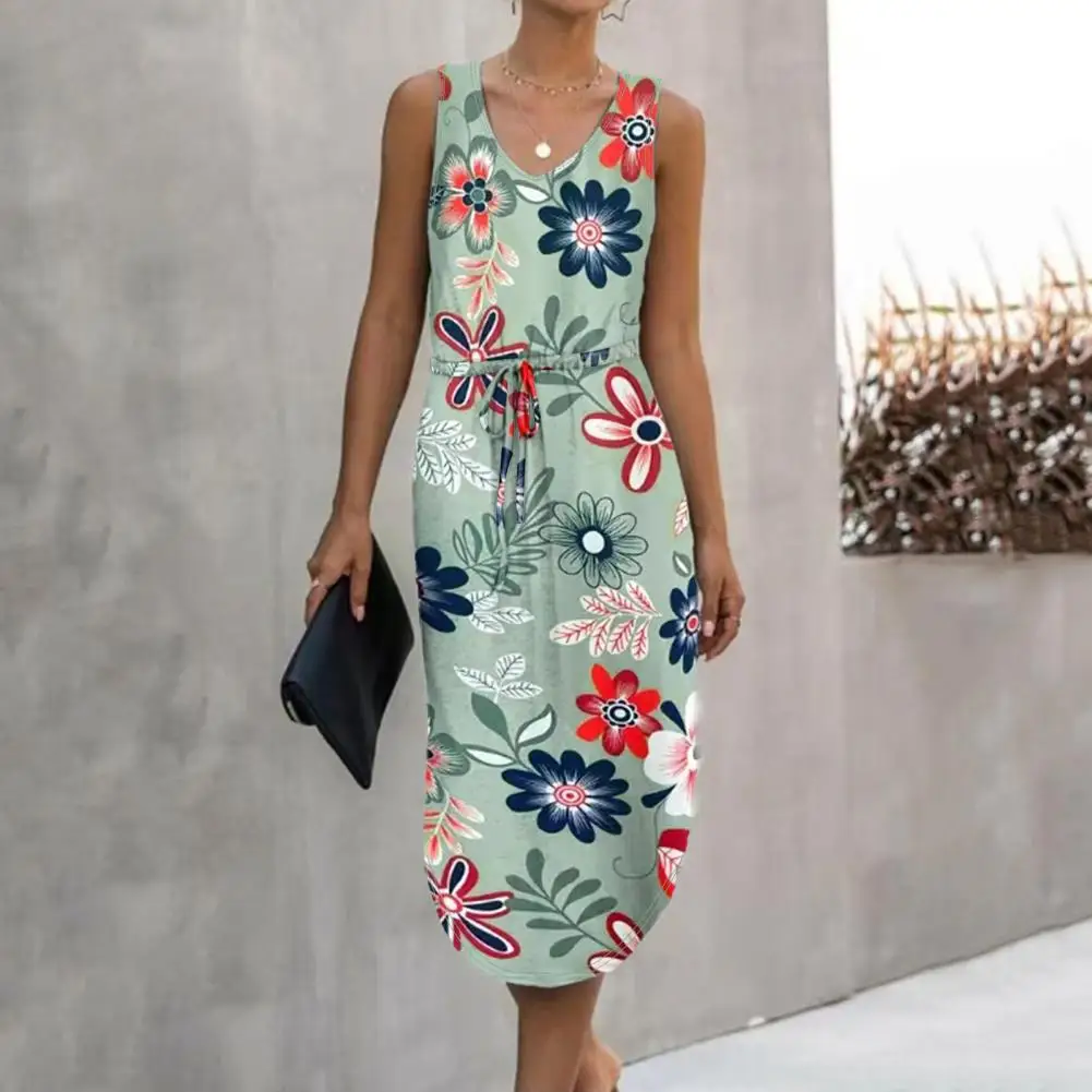 Сарафан женский с цветочным принтом, Элегантный легкий сарафан средней длины с V-образным вырезом, приталенная Талия, лето