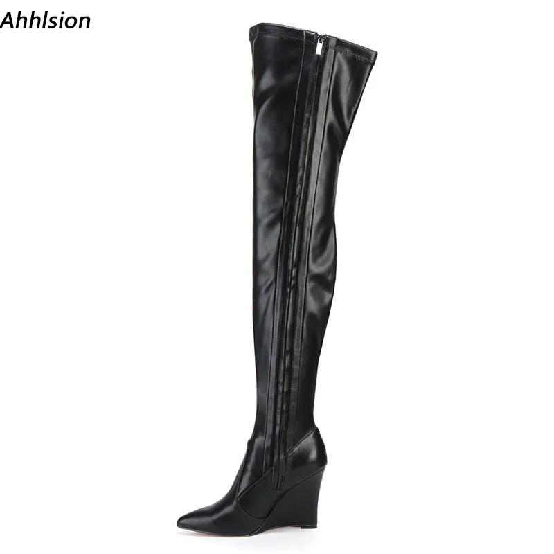 Ahhlsion новые стильные женские весенние сапоги до бедра на танкетке и высоком каблуке с острым носком, черные туфли для косплея, женские большие размеры США 5-15