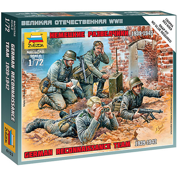 Чтобы собрать модель Zvezda «Немецкие разведчики 1939-42 гг.» не понадобится клей. Элементы надежно скрепляются между собой. Каждая деталь легко и без повреждений отсоединяется от литника. Модель можно раскрасить по цветам из инструкции.