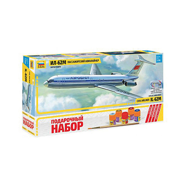 Модель для сборки Zvezda «Советский пассажирский авиалайнер Ил-62М» детально изображает одноименный реактивный гражданский самолет. Каждый элемент легко и без повреждений отсоединяется от литника. В подарочном наборе есть все необходимое, чтобы создать завершенный образ самолета.