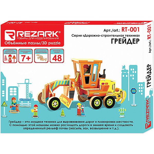 Сборная модель Rezark «Грейдер» состоит из красочных деталей, которые собираются между собой в пазы. Готовая игрушка имеет подвижные части и знакомит ребенка с назначением и принципом работы техники. Внутри кабины размещается фигурка водителя.