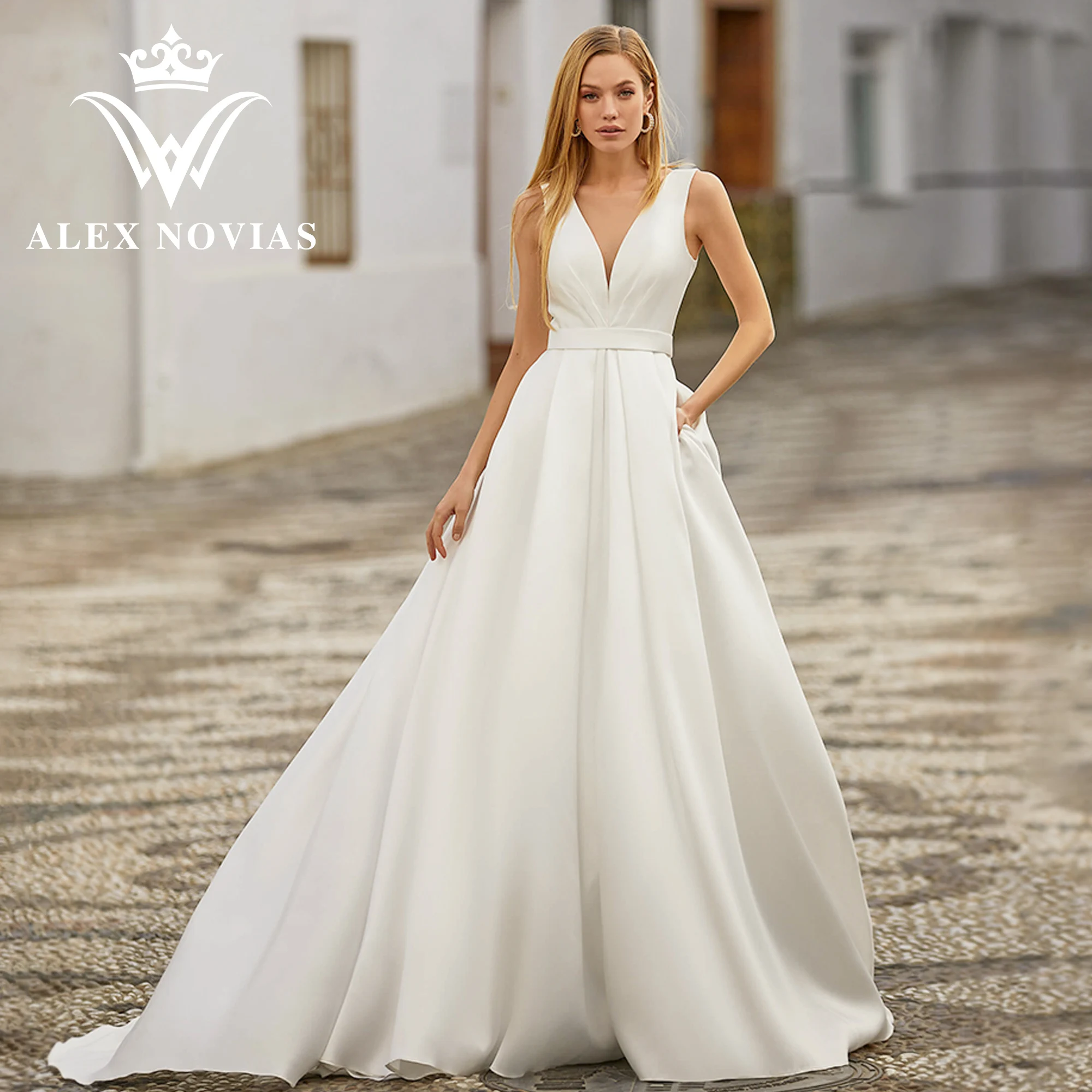 Свадебное атласное платье-трапеция ALEX NOVIAS, черное платье без рукавов с V-образным вырезом и драпировкой на пуговицах, 2023