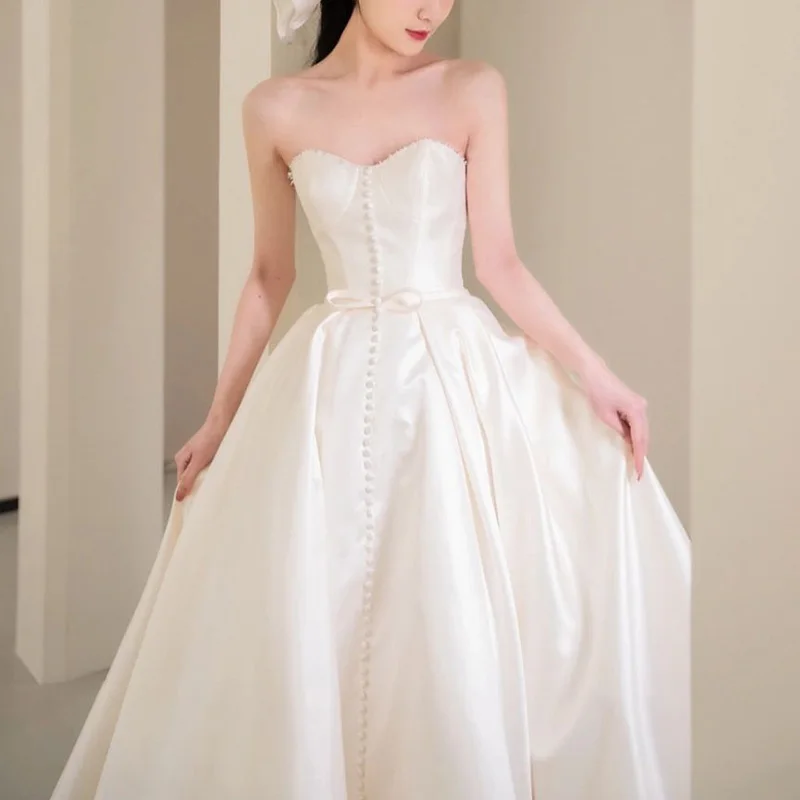 Свадебное платье без бретелек, новое атласное украшение на пуговицах, французское винтажное простое Формальное вечернее платье принцессы