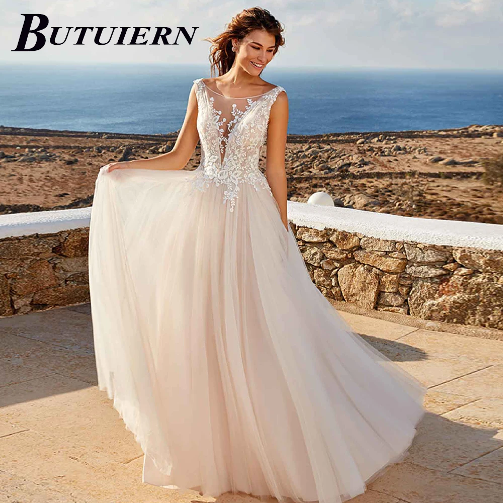 Свадебное платье без рукавов, с аппликацией, круглым вырезом, из тюля, с открытой спиной, на пуговицах, со шлейфом