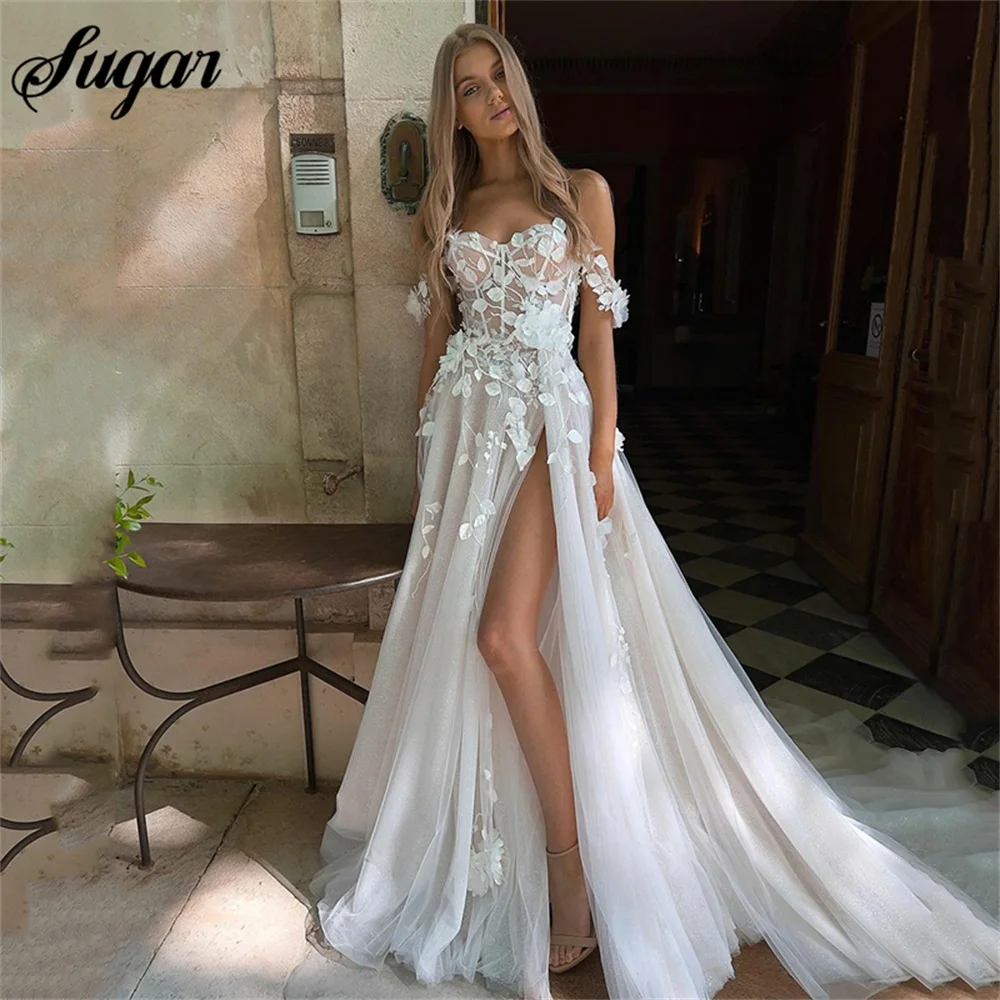 Свадебное платье с объемными цветами, открытыми плечами и разрезом по бокам