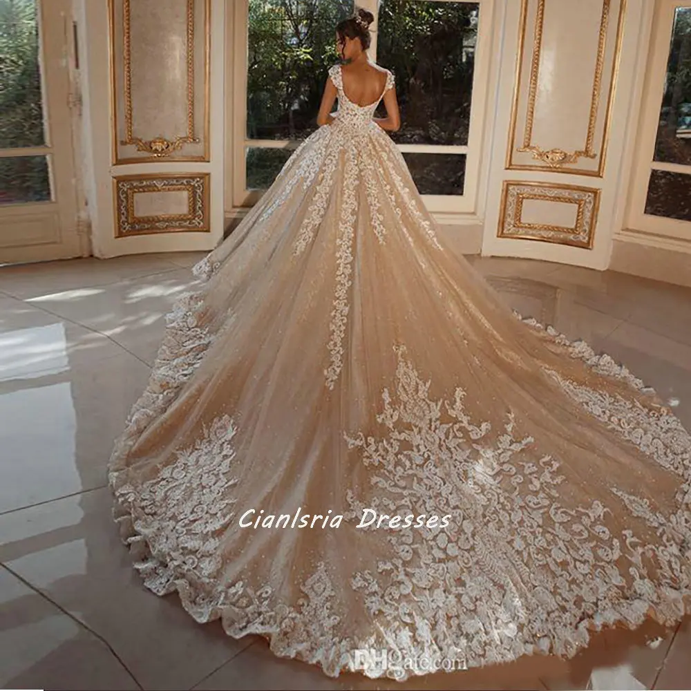 Свадебное платье цвета шампанского, со шлейфом, со стразами