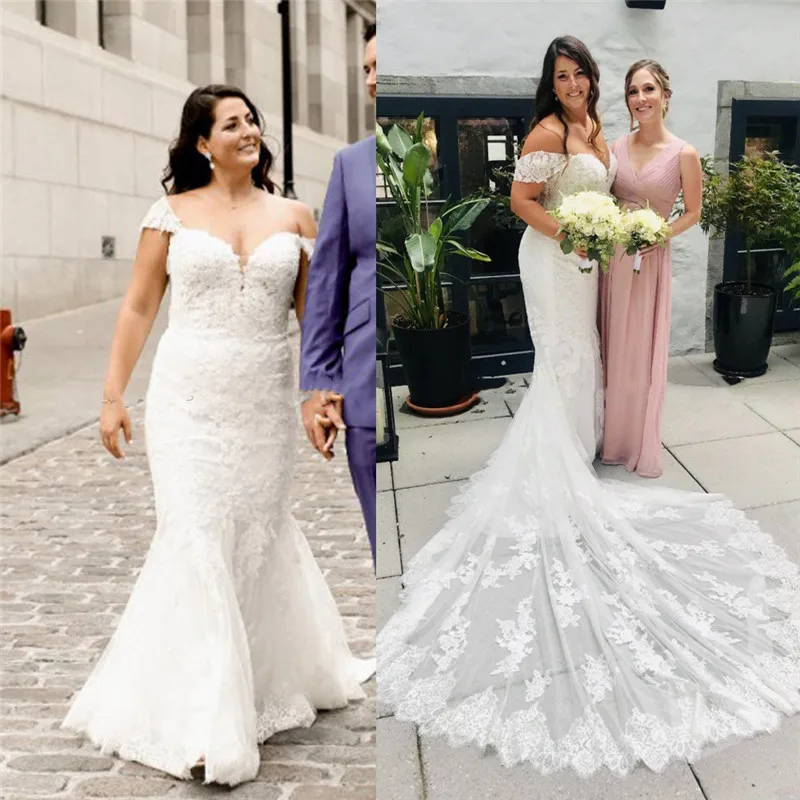 Свадебные платья русалки с открытыми плечами и кружевной аппликацией, на молнии сзади, на заказ, естественная линия талии, Модные свадебные ...
