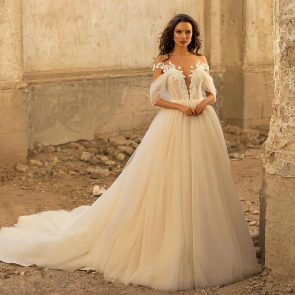 Свадебные платья с коротким рукавом в стиле бохо, платья невесты с открытыми плечами, тюлевые трапециевидные платья со шлейфом