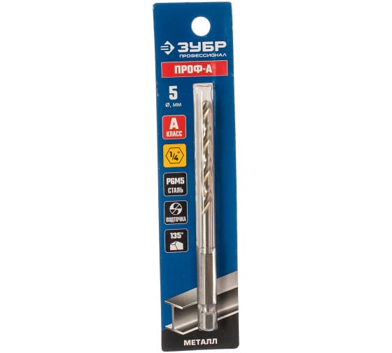 Сверло ⌀5 мм x 10.4 см/5.2 см, сталь Р6М5, по металлу, ЗУБР ПРОФ-А, 1 шт. (29623-5)