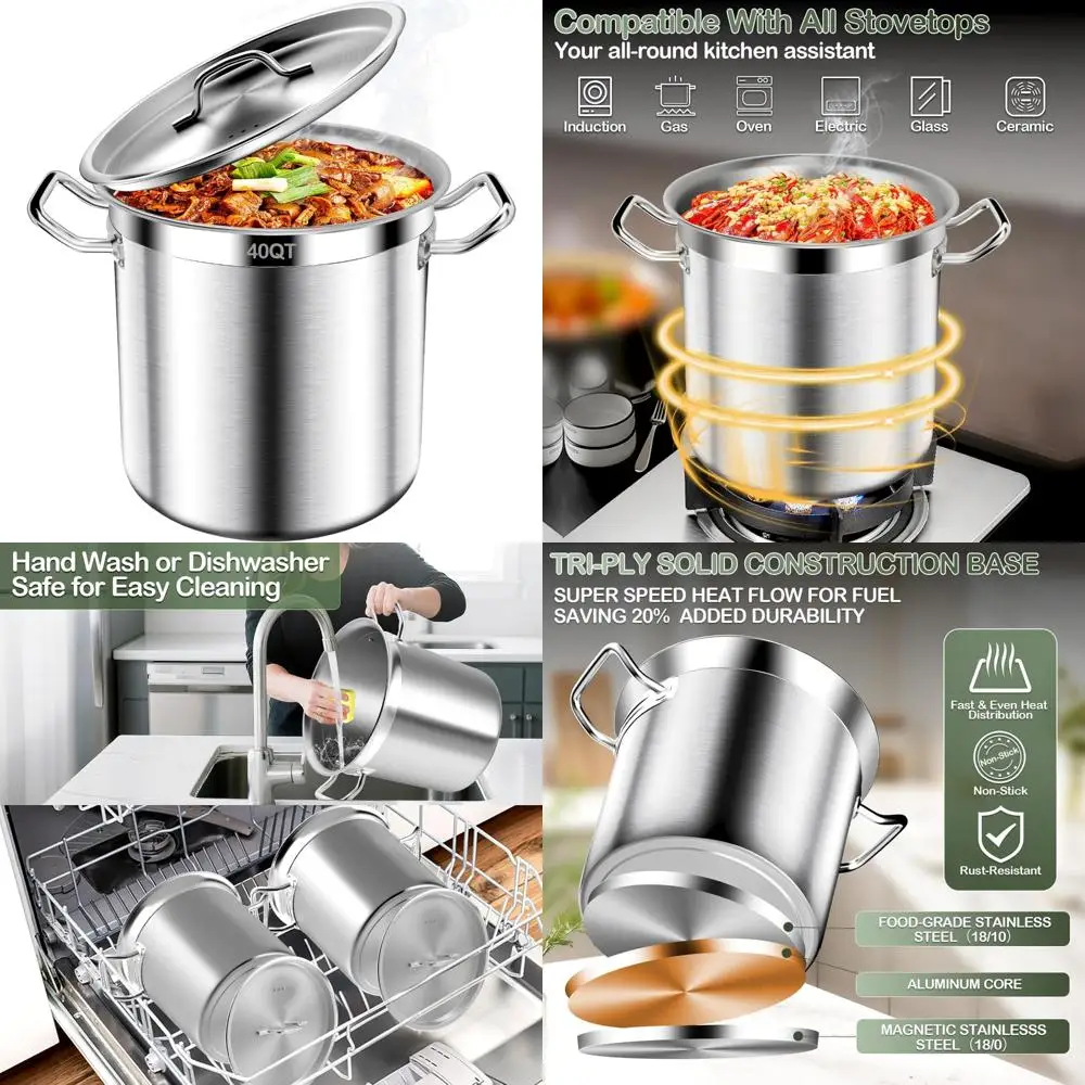 Сверхмощная кастрюля из нержавеющей стали на 40 литров с крышкой — большая кастрюля коммерческого класса для кипячения и приготовления пищи