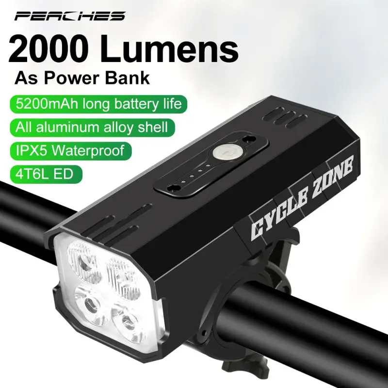4T6 LED Bicycle Light Front 2000Lumen 5200mAh Cycling Flashlight with Power Bank Type-C USB Rechargeable MTB Road Bike Headlight