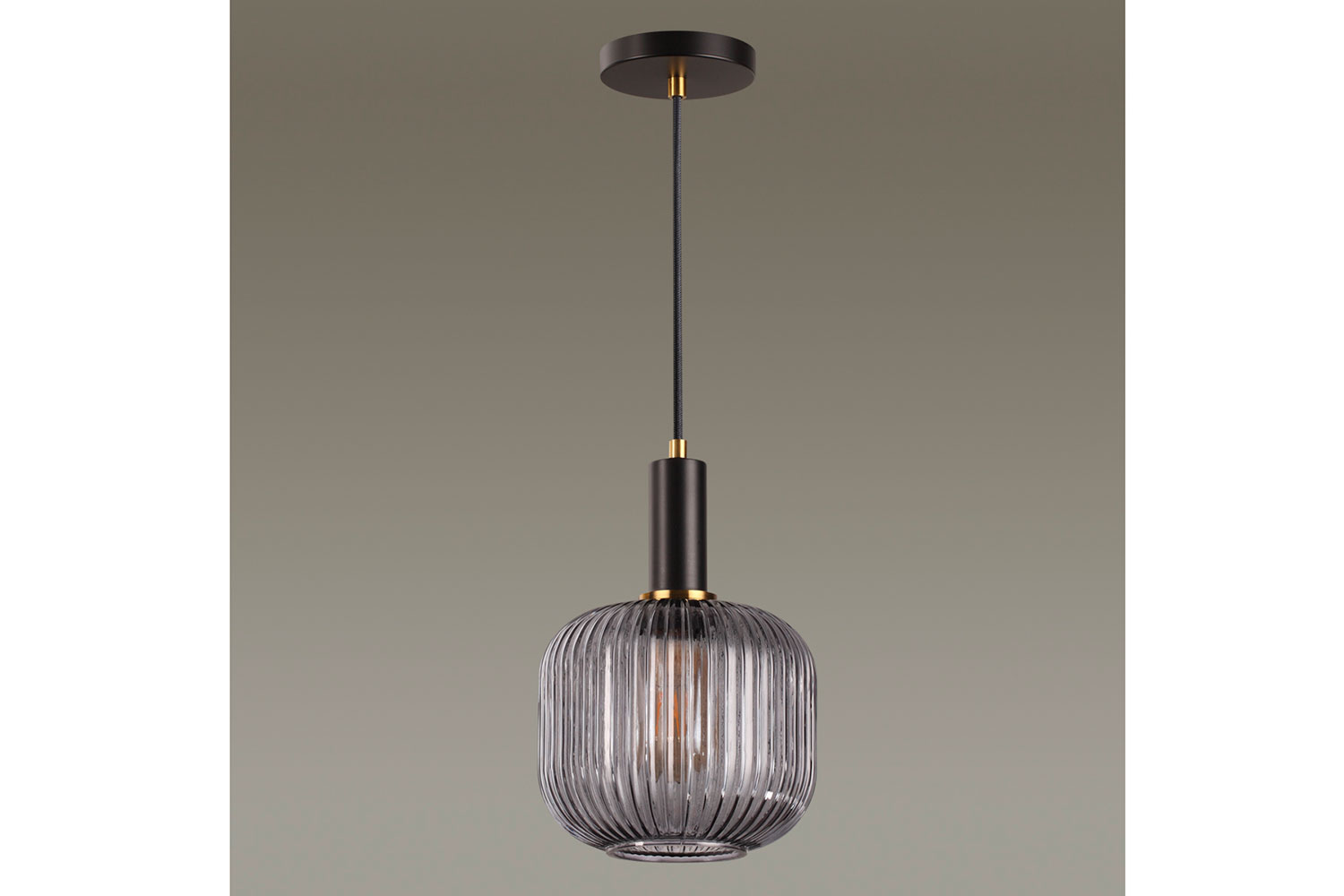 Ультрамодный подвесной светильник Suspentioni Merlin — прекрасное решение для организации эффектной зональной подсветки в современном интерьере. Основание модели выполнено из металла, окрашенного в глубокий черный цвет, и дополнено медными декоративными элементами — непременным атрибутом лофт-пространства. Плафон, изготовленный из тонированного стекла, красиво декорирует лампу. Его волнистая поверхность делает освещение более живым, игривым. Благодаря возможности регулировки длины подвеса светильник можно подтянуть поближе к потолку или опустить вниз.