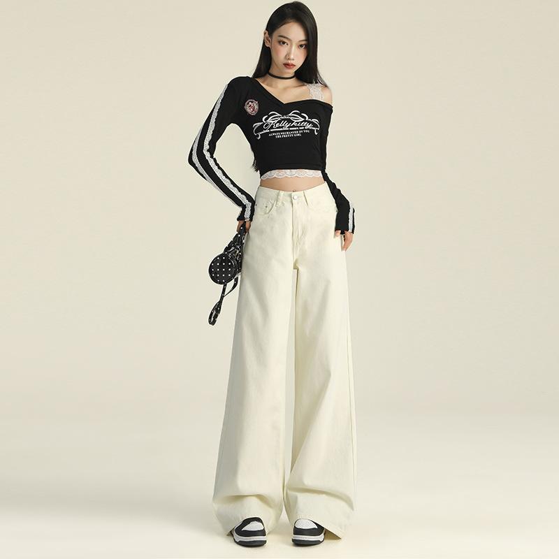 Светло-абрикосовый цвет с плюшевым утолщением/Обычные широкие джинсы 2024 Осень/Зима Новые прямые брюки до пола с высокой талией XL абрикосовый света