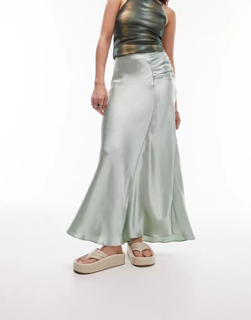Светло-зеленая асимметричная юбка макси со сборками Topshop