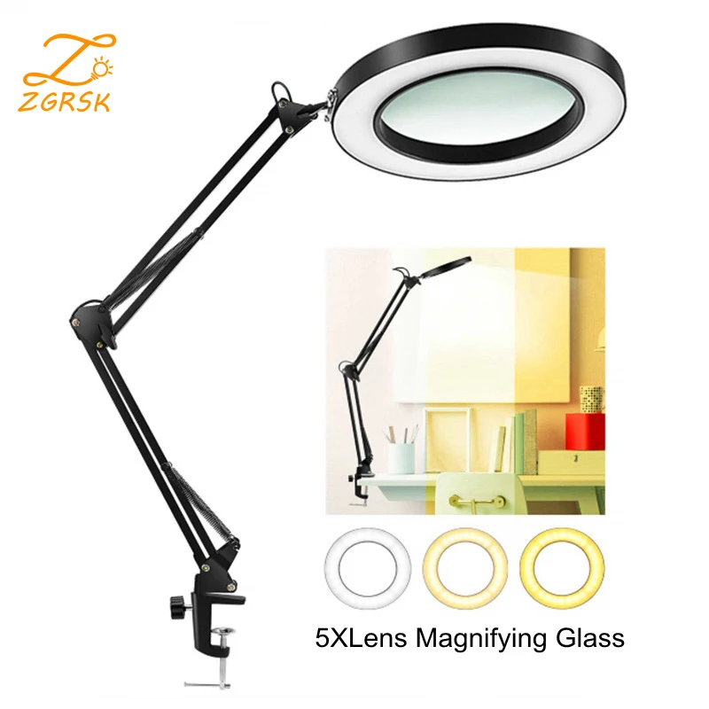 Светодиодная настольная лампа с клипсой, приглушаемый светильник с 5 линзами, с длинным зажимом, 3 цвета, для чтения татуировок и компьютеров