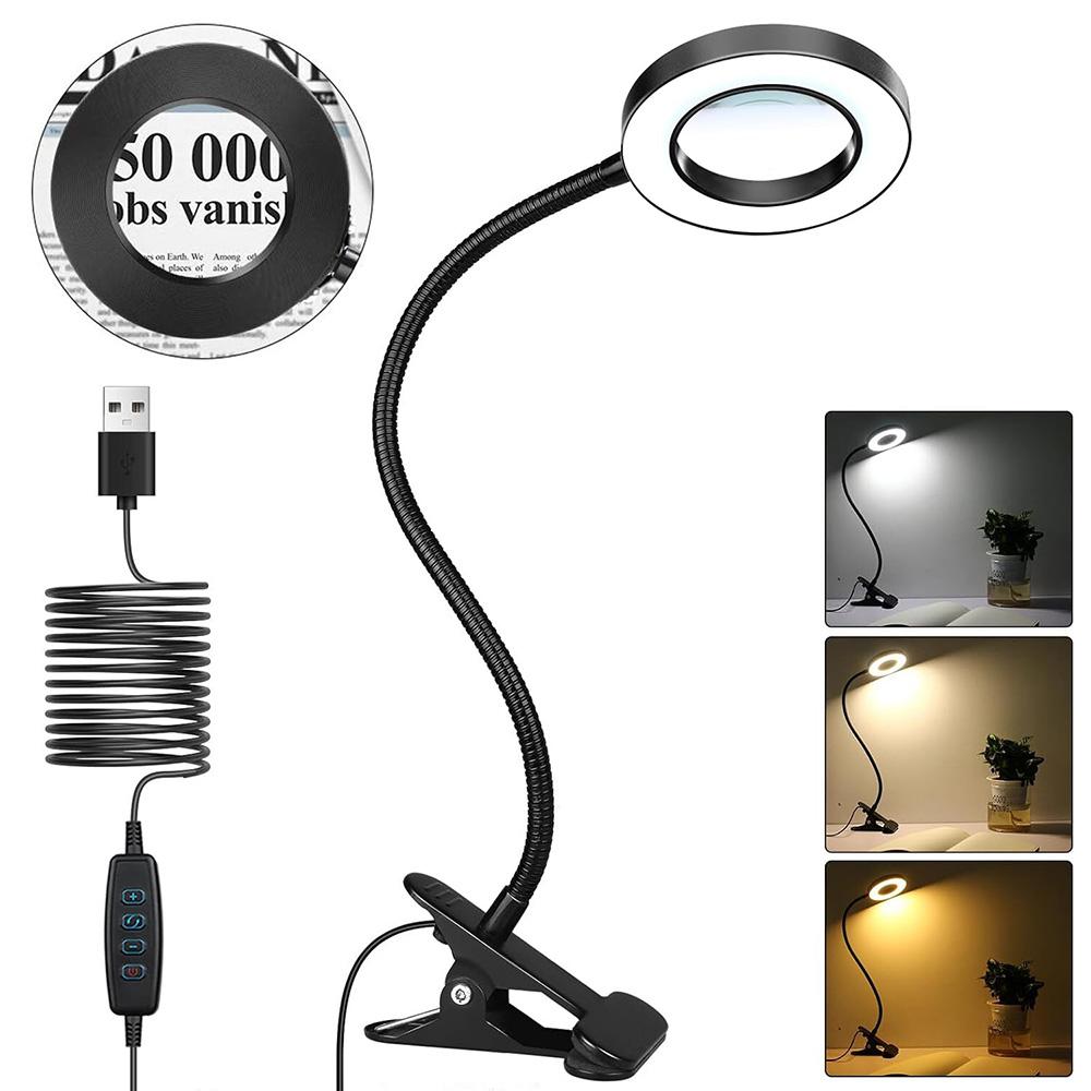 Светодиодная настольная лампа с 5-кратным увеличительным стеклом и зажимом, 3 цветовых режима, регулируемая яркость, питание от USB, гибкая настольная лампа для чтения на гибкой ножке