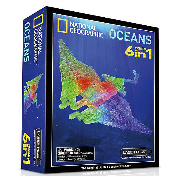 Конструктор Laser Pegs National Geographic «Океан» состоит из разноцветных прозрачных деталей разных форм и размеров. Из них можно собрать модели обитателй океана. В набор включены эффектные светящиеся детали, которые включаются, когда модель присоединяется к панели. Можно использовать как ночник.