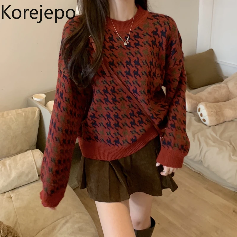 Свитер женский в стиле ретро с круглым вырезом и длинными рукавами