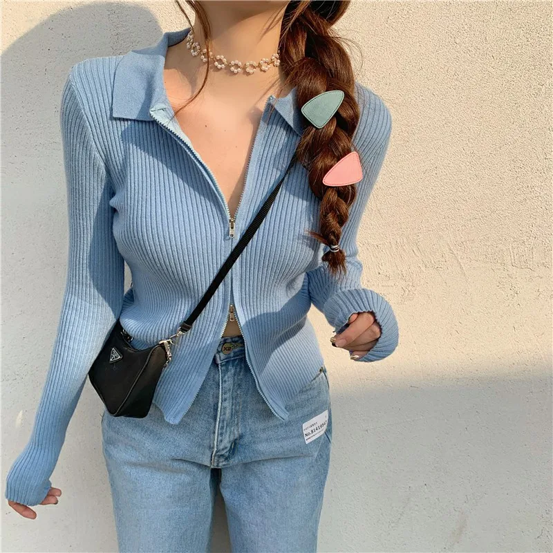Свитер женский трикотажный на молнии, пикантный кардиган с лацканами, Повседневная рубашка, короткое пальто, синий цвет, осень 2020