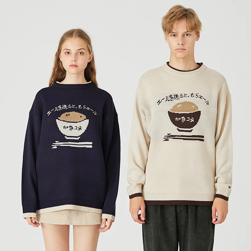 Свитер женский трикотажный с мультяшным принтом в японском стиле хаки и синего цвета