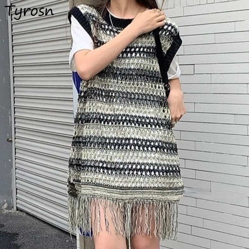 Свитер с кисточками, жилеты, Женская индивидуальная вязаная шикарная летняя универсальная уличная одежда с вырезами в стиле Харадзюку, хипстерский дизайн с Боковым Разрезом