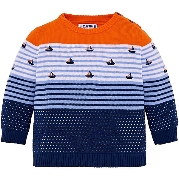 Свитер изготовлен из мягкой и натуральной ткани. Материал дышащий. Длинные рукава не перекручиваются. Круглая горловина с ребристым кантом не натирает. На плече две пуговки для удобства надевания. Декорирован узорами и принтом с корабликами.