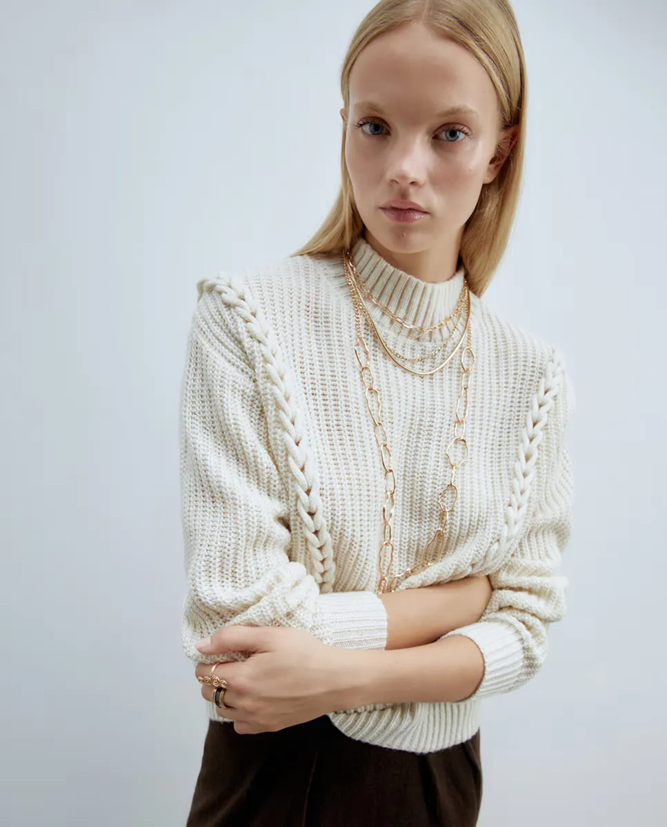 Вязаный свитер с длинными рукавами и воротником Perkins. Деталь косы спереди.