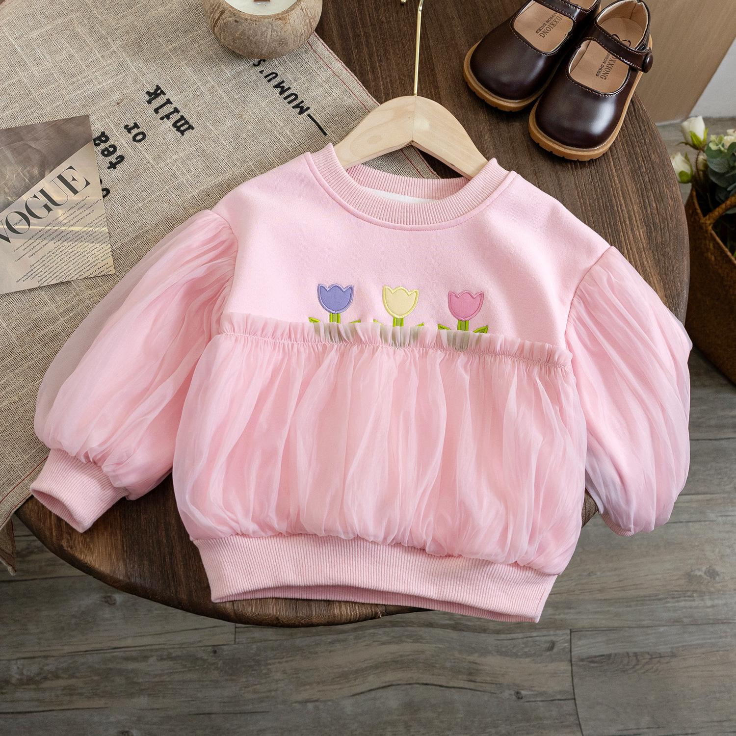 Свитшот для девочек 1-6 лет, кружевной цветочный свитер для детей, весна-осень, вышитые цветы, детские топы, детская одежда в корейском стиле 120cm/4T розовый