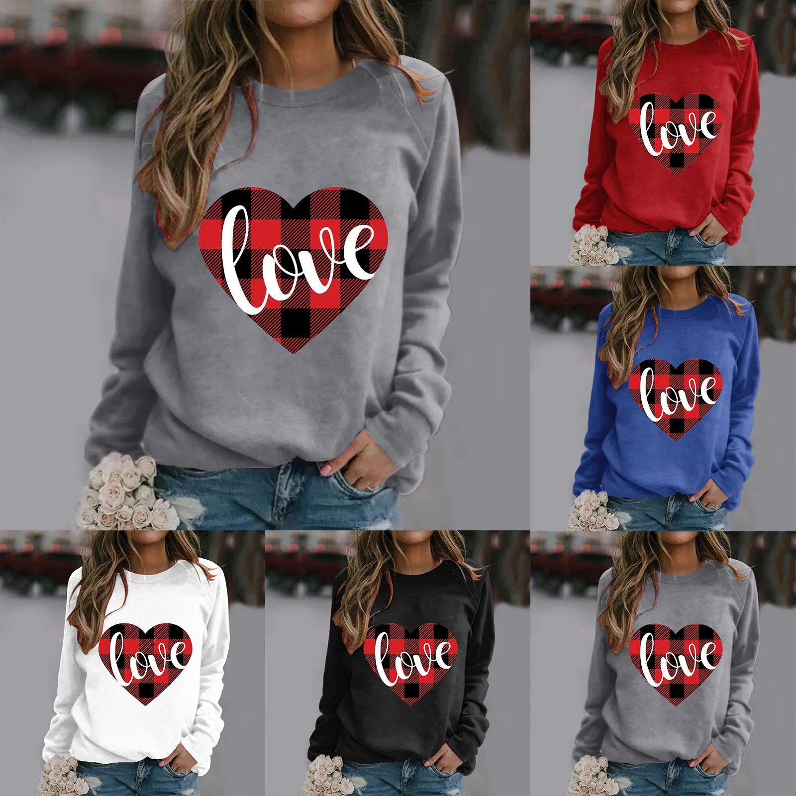Свитшот женский с круглым вырезом, повседневный свитшот в клетку, с длинным рукавом, с принтом сердец, в стиле ретро, осень