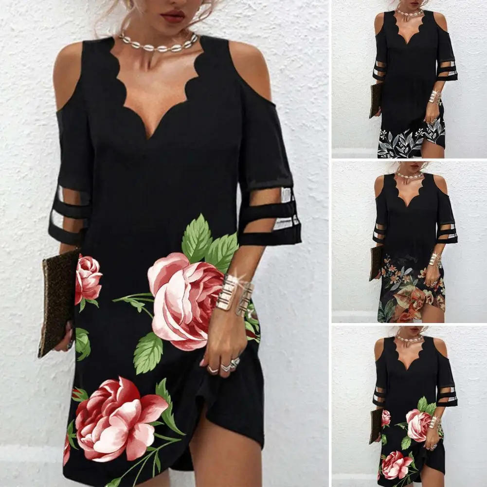 Свободное летнее платье с V-образным вырезом и цветочным принтом, Сетчатое строченное мини-платье с открытыми плечами и рукавом до локтя, же...