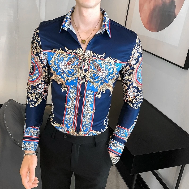 Сезон весна; Новинка; 2021 класса люкс с винтажным принтом Мужская рубашка смокинг рубашка с длинным рукавом для ночного клуба/Пром/Вечерние П...