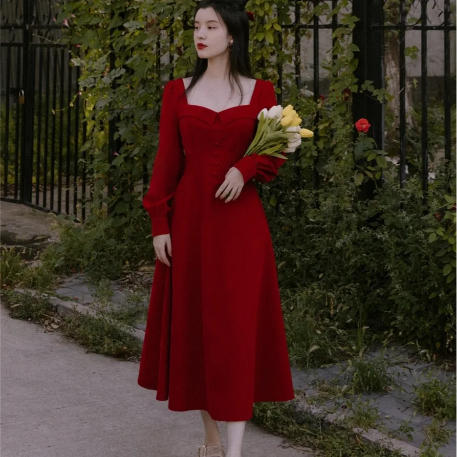 Сезон: весна-лето женское красное платье в винтажном стиле; Элегантный Стиль с короткими и длинными рукавами большой Размеры женские вечерн...