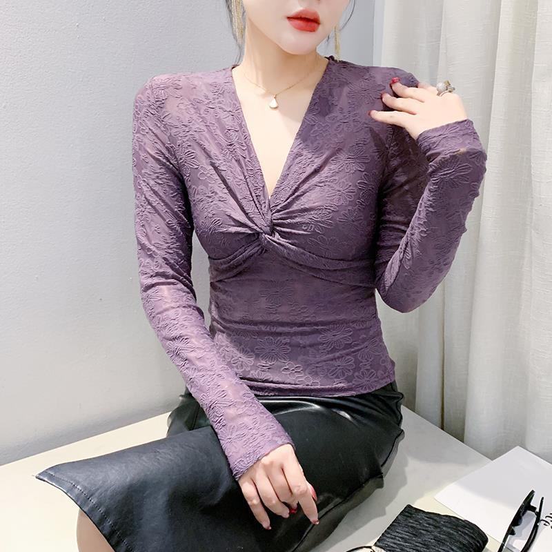 Сексуальная кружевная рубашка с V-образным вырезом и длинными рукавами для женщин. Весна. Новый стиль. Облегающая рубашка. M