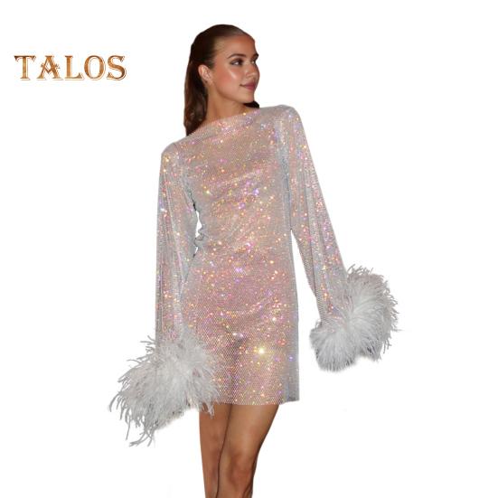 Сексуальное блестящее вечернее платье с меховой отделкой на манжетах, круглым вырезом, длинными рукавами, прозрачным облегающим платьем M белый