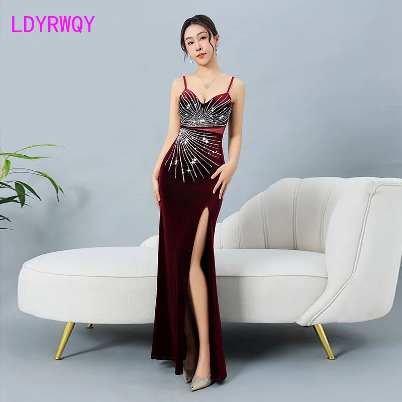 Сексуальное вечернее платье на бретельках с украшением из страз и разрезом, покрывающим ягодицы