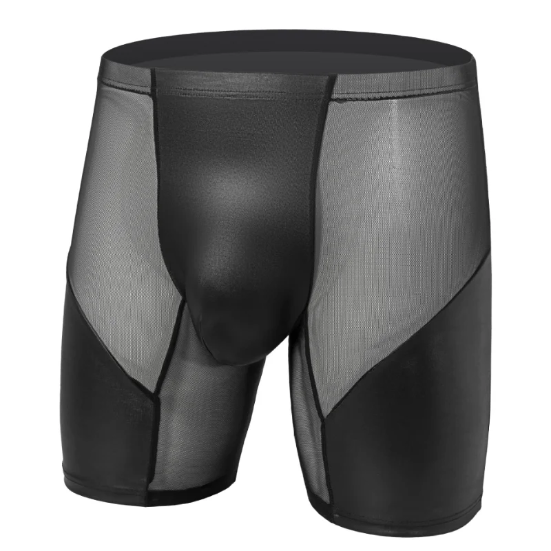 Сексуальное нижнее белье для мужчин, Длинные боксеры, шорты из искусственной кожи, сетчатые трусы с мешочком для пениса, нижнее белье, трусы-боксеры для геев, размеры 2XL