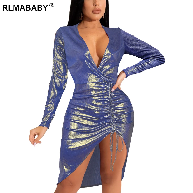 Сексуальное облегающее мини-платье со складками, с глубоким V-образным вырезом и длинным рукавом, модное блестящее однотонное облегающее пл...