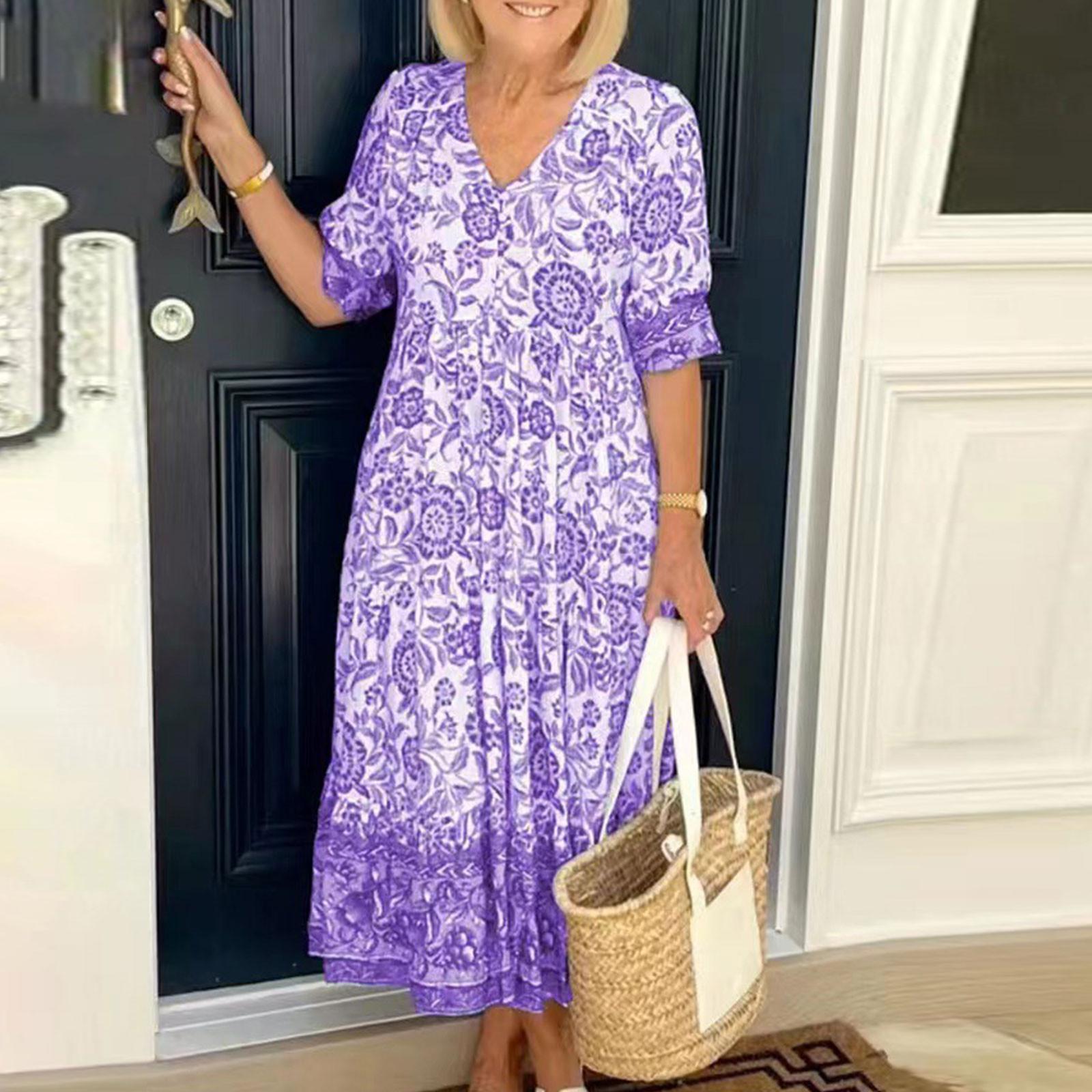 Сексуальные платья для женщин, богемный цветочный принт, сексуальный V-образный вырез с коротким рукавом, пляжная струящаяся вечеринка макси XXL фиолетовый