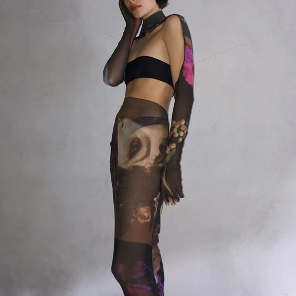 Сексуальный облегающий прозрачный сетчатый комплект из двух предметов с принтом, женский сексуальный укороченный топ и облегающая юбка, Кл...