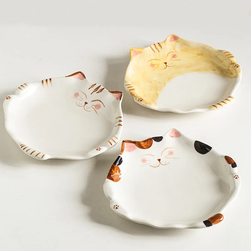 Сельская керамическая маленькая домашняя декоративная тарелка в форме кота в японском стиле с подглазурной росписью для ежедневного использования с красочной росписью