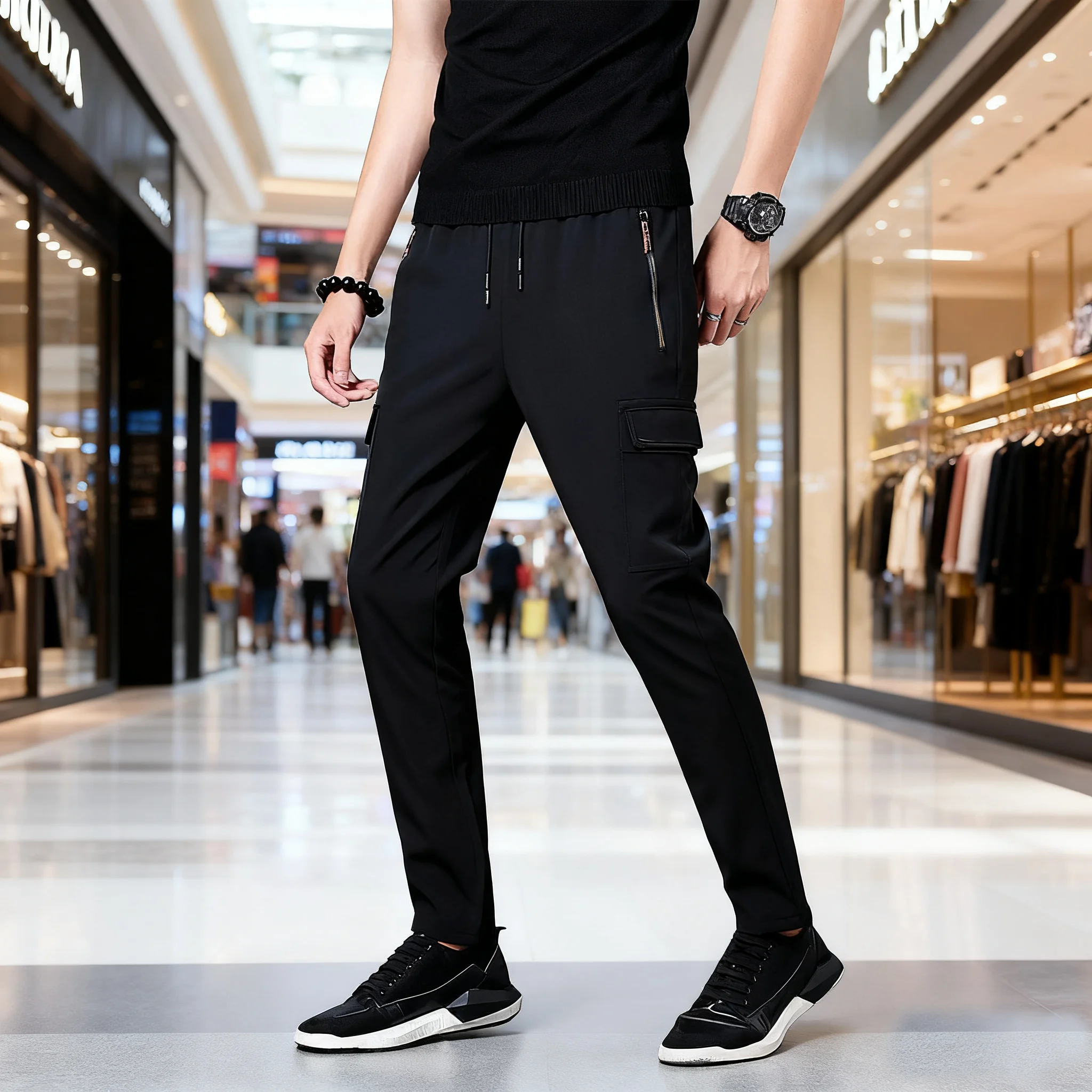 New fashionable solid color lace up side zipper straight leg pants with solid color elastic waist for men's pants