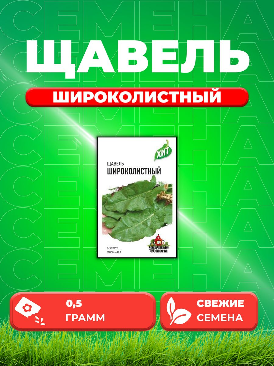 Раннеспелый, высокоурожайный сорт многолетней зимостойкой культуры. Розетка листьев прямостоячая. Лист удлиненно-яйцевидный, темно-зеленый, гладкий или слабопузырчатый, с ровным или слабоволнистым краем, длиной 14-15 см, шириной 7-8 см, с черешком длиной 18-20 см. Пригоден для многократной срезки зелени в течение сезона. Урожайность до 7,5 кг/м2.. Семена Щавель Широколистный, 0,5г, Удачные семена, х3