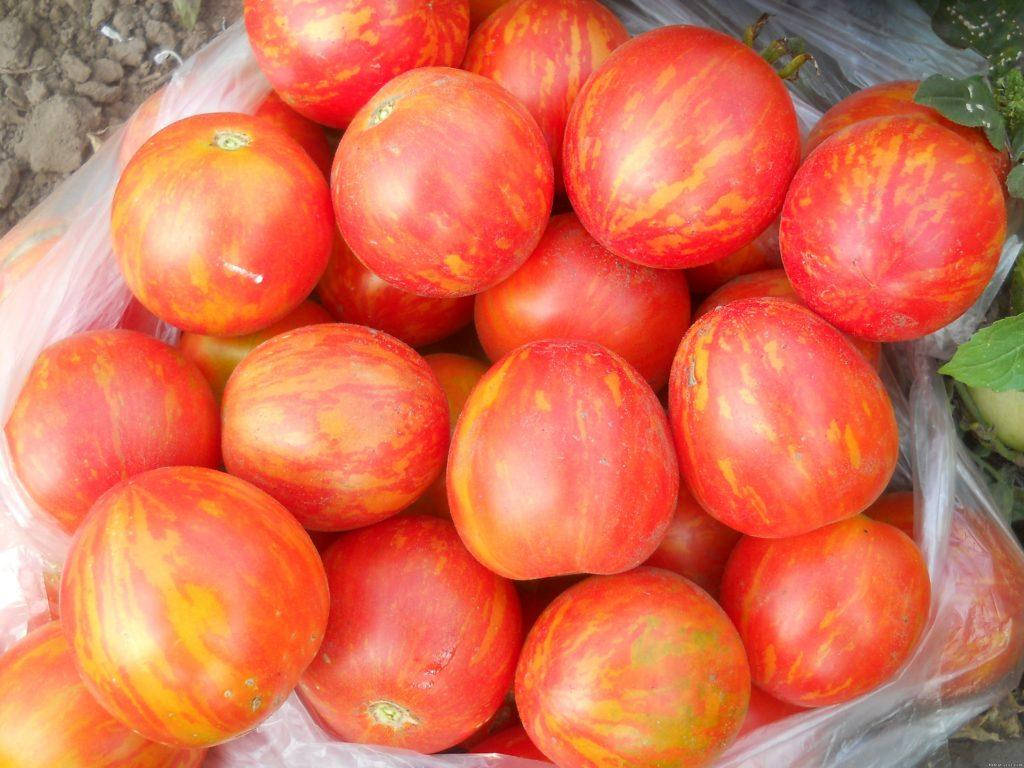 Раннеспелый, урожайный. Период от всходов до спелости 95-105 дней. Высокорослый, 200-250 см. Плоды оригинальной окраски, оранжево-красные с желто-зелеными зубчатыми полосками, округлой формы, выровненные, мясистые, массой 100-130 г, хорошего вкуса.