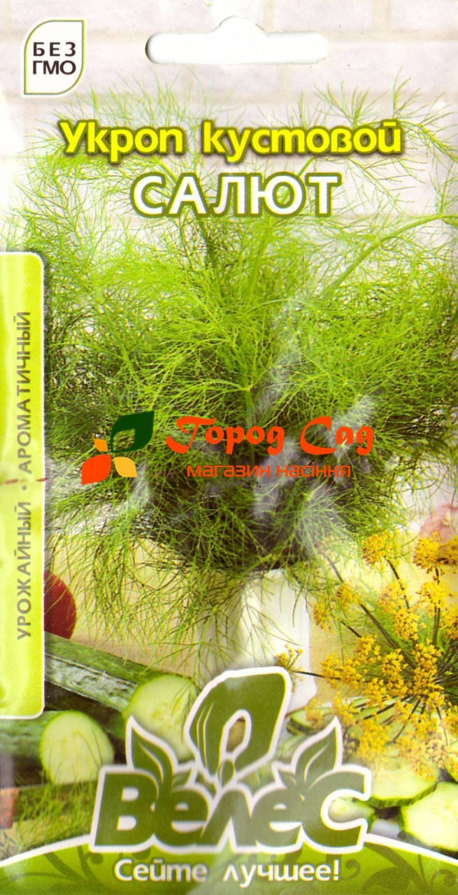 Семена укропа Салют (кустовой) 4г Позднеспелый сорт. Первую уборку зелени проводят через 50-65 дней. Растение кустовое, высотой 45-55см, массой 70-100г. Листья крупные, длиной 12-16см, светло-зеленые со слабым восковым налетом, отличного вкуса и аромата. Сорт ценится за медленное стеблевание, что позволяет продлить срок хозяйственной годности. Используют для потребления в свежем виде, сушки и при консервировании.