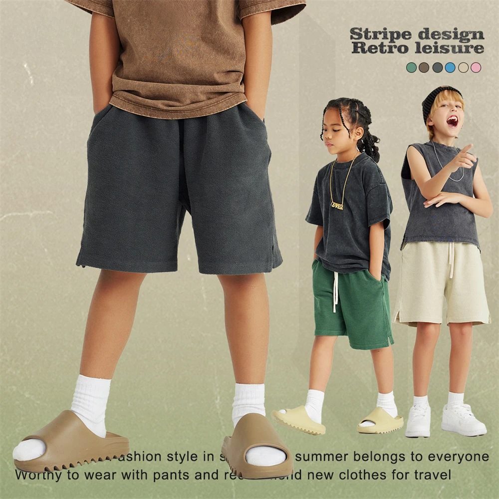 Kids Summer 340gsm 100% Cotton Shorts Children Retro Hip Hop Loose Washed Side Slit Short Pants For Boys And Girls